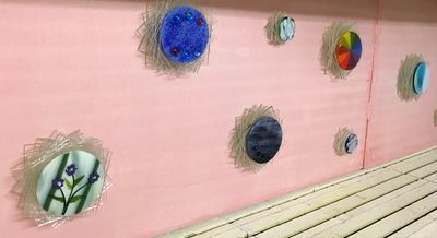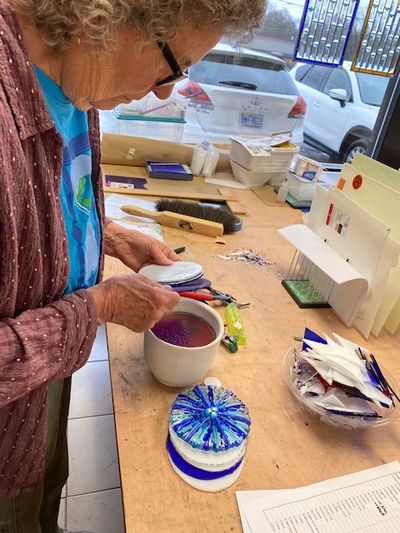 The kiln is loaded and ready to fuse these stack melts - a technique taught in one of Paul Tarlow's ebooks. There are 4" squares with a circle on top with the design. These projects were created in one of our advanced fusing classes. See result below.