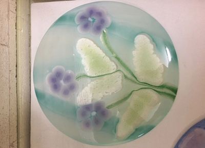 Post firing of the stack melt in the lower left corner of the image above. The finished piece is about 10" in diameter.